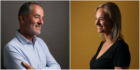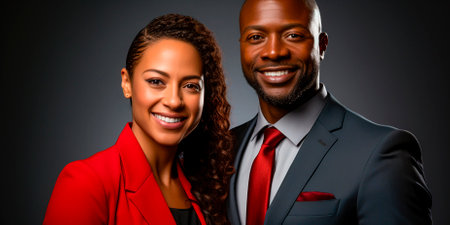 A man and woman pose together, showing confident expressions and formal clothing in a studio setting.