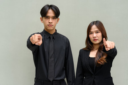 Mature Asian businessman and mature Asian businesswoman together against brown background