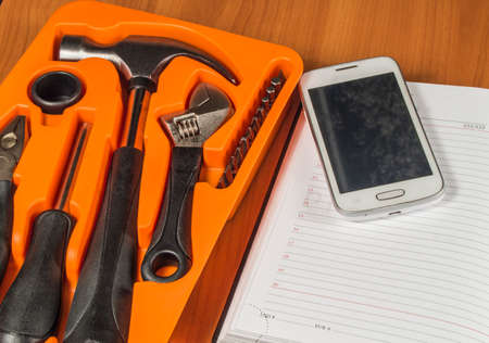 Various tools, mobile phone and the blank notebook.