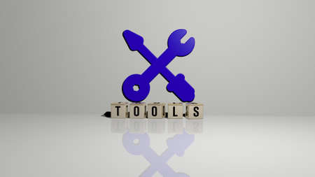 3D representation of TOOLS with icon on the wall and text arranged by metallic cubic letters on a mirror floor for concept meaning and slideshow presentation. illustration and background