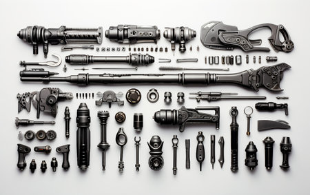 Flat lay of a scaffolding assembly kit with bolts, clamps, and metal pipes arranged in a precise layout.