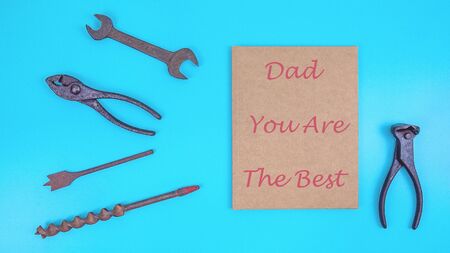 Old work tools and card Dad You Are The Best on bright blue background for fathers day overhead top view flatlay