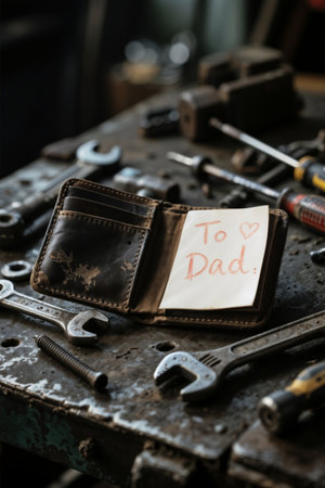 Leather Wallet with 'To Dad' Note on a Workshop Surface