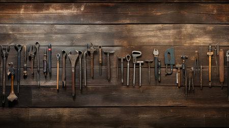 An array of traditional carpentry tools laid out on an old wooden table, including saws and chisels, showcasing the craftsmanship created by skilled carvers in ancient times. The photo is taken from above with natural lighting, emphasizing details such as textures and patterns on each tool. This visual representation highlights how these vintage handcrafting equipment were used to create intricate woodwork designs. --chaos 30 --ar 16:9 --v 6.1 Job ID: 8f9489ae-3a5e-42ed-95bf-440f6b391a77