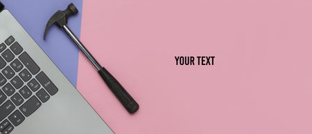 Service center, laptop repair. Laptop and hammer on pink purple background. Top view. Copy space