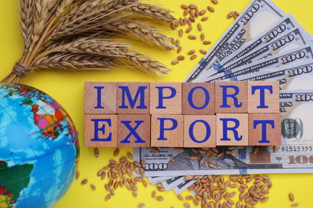 Words Import and Export made of wooden cubes, globe, ears of wheat and money on yellow background, flat lay