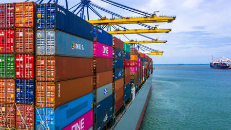 Container ship carrying container box in import export with quay crane, Global business cargo freight shipping commercial trade logistic and transportation oversea worldwide by container vessel.