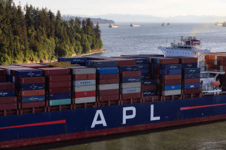 Vancouver, British Columbia, Canada - June 26, 2021: Aerial View from Above of a Cargo Ship arriving to the Port on the West Coast Pacific Ocean during a sunny evening.