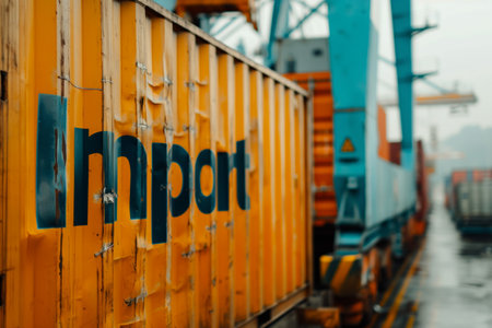 hipping container labeled Import, detailed texture, set in a dockyard