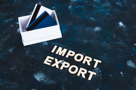 international trade and global business concept, Import Export text next to open parcel box with credit cards