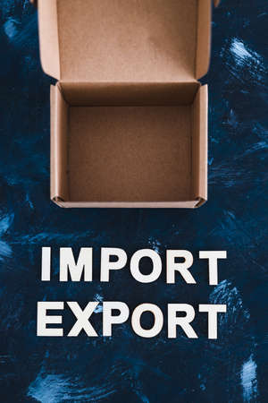international trade and global business concept, Import Export text next to open parcel box