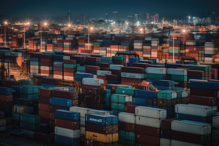 The dock comes alive at dusk with a vibrant mix of shipping containers and illuminated cranes working against a twilight backdrop. Generative AI.