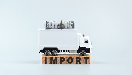 White toy truck on blocks with the text IMPORT. Logistics and wholesale trade concept.