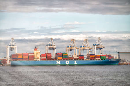 Container Ship in the Port of Hamburg at Sunset, Germany. Horizontal Image Composition