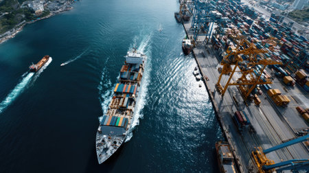 This aerial image showcases a container ship docking at a busy port, surrounded by colorful shipping containers and heavy machinery, highlighting maritime transportation.