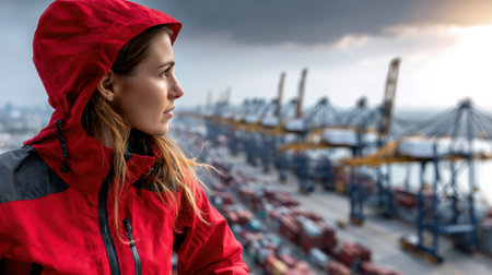 A woman in a red jacket stands on a bridge overlooking a busy port. The scene is bustling with activity, with numerous cargo ships docked and ready for loading and unloading