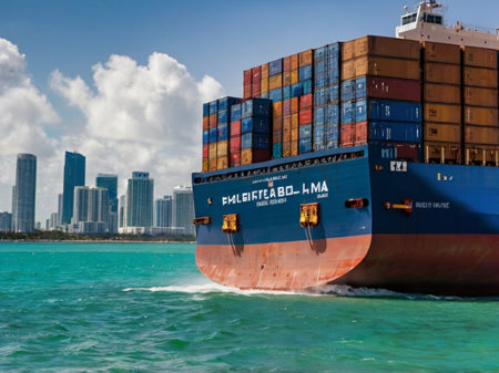 Cargo ship in the harbor of Miami, Florida, USA.