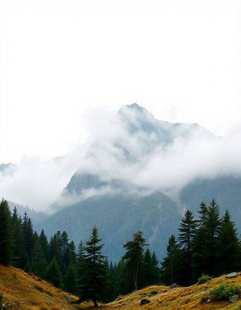 Mountain landscape with pine trees and foggy clouds in the background
