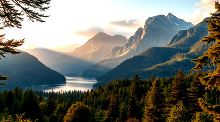 Mountain lake and forest. Beautiful nature landscape. Panoramic view.