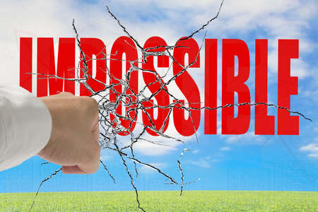 Man hand hitting red impossible word on cracked transparent glass with nature sky grass background