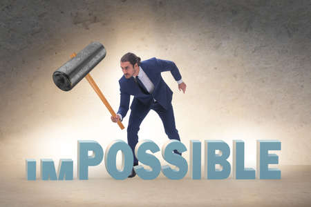 Businessman hitting the word impossible with hammer