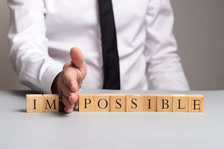 Wooden blocks spelling the word impossible with businessman pushing away letters im with his hand.