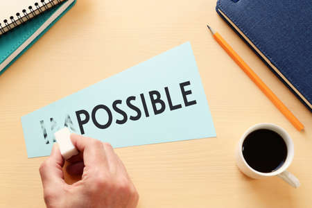 Changing the word impossible to possible with a pencil eraser. Motivation startup concept.