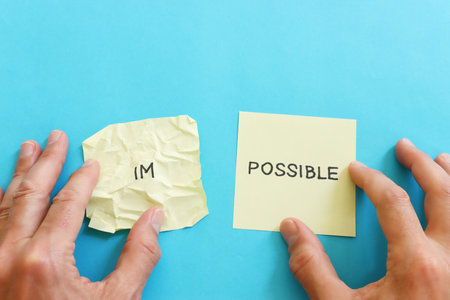 human hand poking impossible to possible words on white paper background