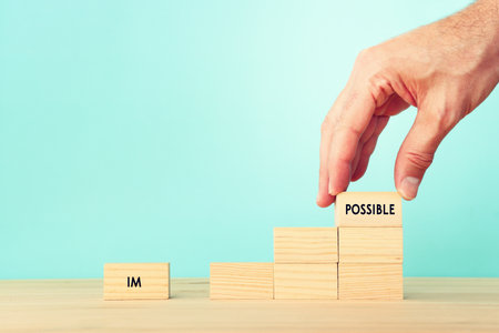 Positive mindset, business, success, challenge, motivation, achievement and possible concept. Growth mindset success. Hand holds wooden cubes with red crossed out on first 2 alphabets of impossible.