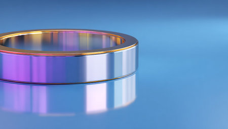 Shiny, close-up of a golden-rimmed ring with reflective surfaces on a gradient blue backdrop
