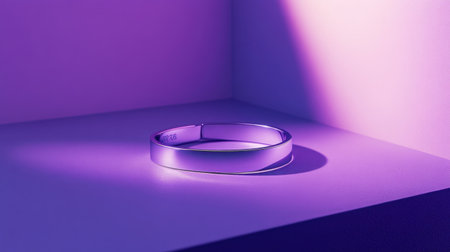 A stunning silver bangle bracelet rests gracefully on a minimalist surface, beautifully illuminated by soft purple light, capturing contemporary elegance and style.