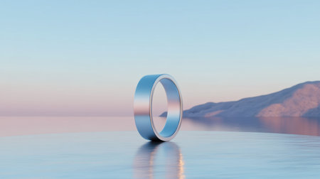 A sleek silver ring rests on a serene water surface, reflecting the soft hues of dusk. The tranquil mountains in the background enhance the minimalist beauty of this scene.