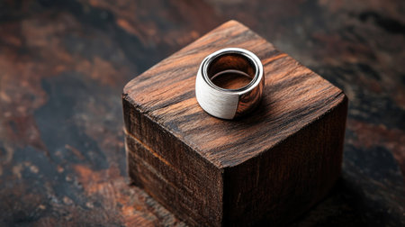 This stunning silver ring rests on a beautifully textured wooden display, highlighting the elegance and craftsmanship of jewelry design. Perfect for showcasing luxury accessories.