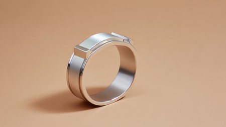 A sleek and modern silver ring is showcased against a soft beige background, highlighting its polished surface and elegant design, perfect for jewelry enthusiasts.