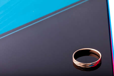 Gold wedding ring on a dark blue background. Jewelry concept.