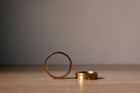 A stunning capture of two metallic rings, one gold and one silver, symbolizing love and unity. Perfect for wedding themes and jewelry marketing visuals.