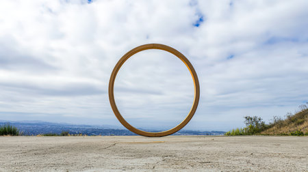 A large wooden circle rests on a concrete surface surrounded by scenic landscape and cloudy sky in broad daylight creating an artistic display.