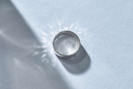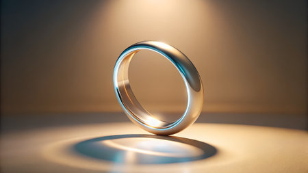 A highly polished silver ring sits on a light-colored surface, illuminated by a warm spotlight creating a distinct shadow.