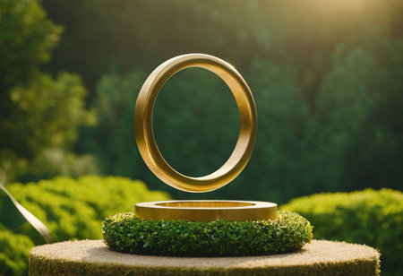 Round golden podium for product presentation on green nature background. Product mockup