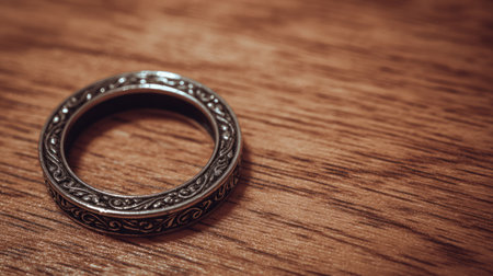 This image features an antique silver ring with intricate patterns resting elegantly on a wooden table surface, highlighting craftsmanship and detail.