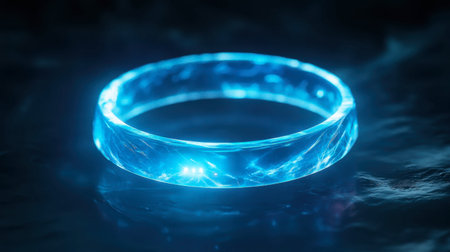 Blue cybernetic ring floating in dark space, emitting soft neon glow, computer-generated image