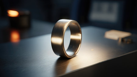 Stylish black ring resting on a smooth surface illuminated softly