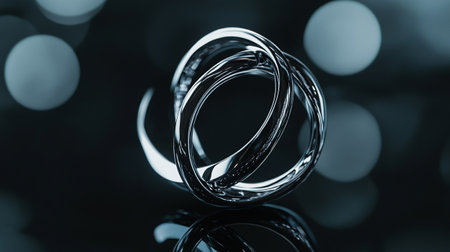Silver wedding rings on a black background with bokeh effect.