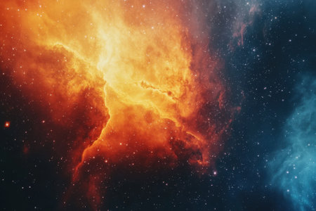 A colorful space scene with a red and yellow cloud in the middle. The stars are scattered throughout the image, with some closer to the foreground and others further away. Scene is one of wonder