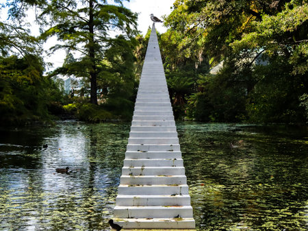 A sleek, contemporary staircase ascends amidst lush greenery, guiding the eye through peaceful woods reflected in calm water below, blending nature with minimalist design