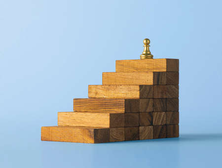 Business growth, business success or career path success concept. A pawn chess is on the top of wooden stacked staircase in blue scene background.