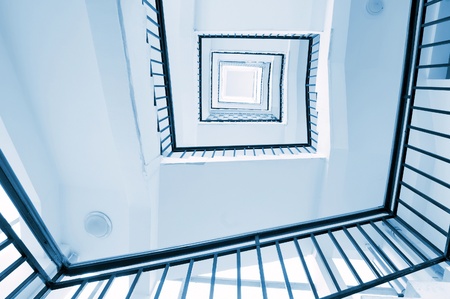 Abstract view of a spiral staircase with a blue tint, emphasizing the modern architectural design and symmetry.