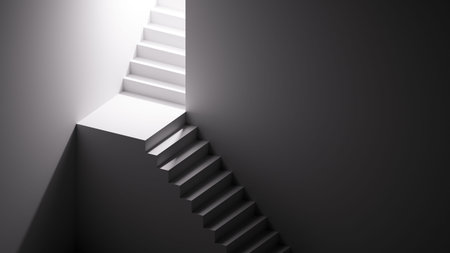 Business rise, forward achievement, progress way, success and hope creative concept: Ascending stairs of rising staircase in rough dark empty room with light with concrete floor and concrete wall 3d illustration