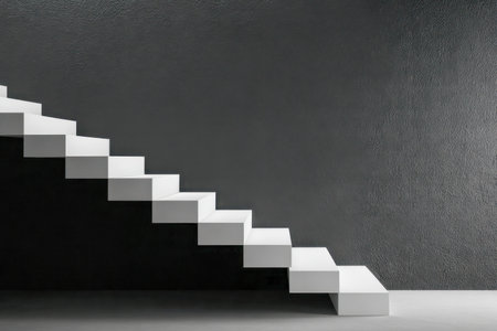 A sleek white staircase with precise geometry and crisp shadows contrasts strikingly with a textured dark gray backdrop, embodying contemporary elegance.