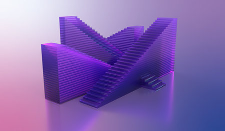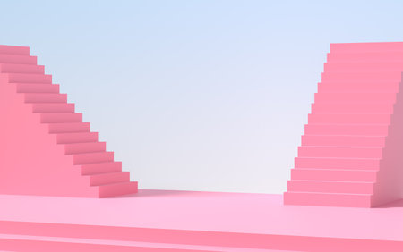 3D illustration of two pink staircases facing each other, minimalistic pastel background with empty space for text or objects, creative projects, advertisements, presentation